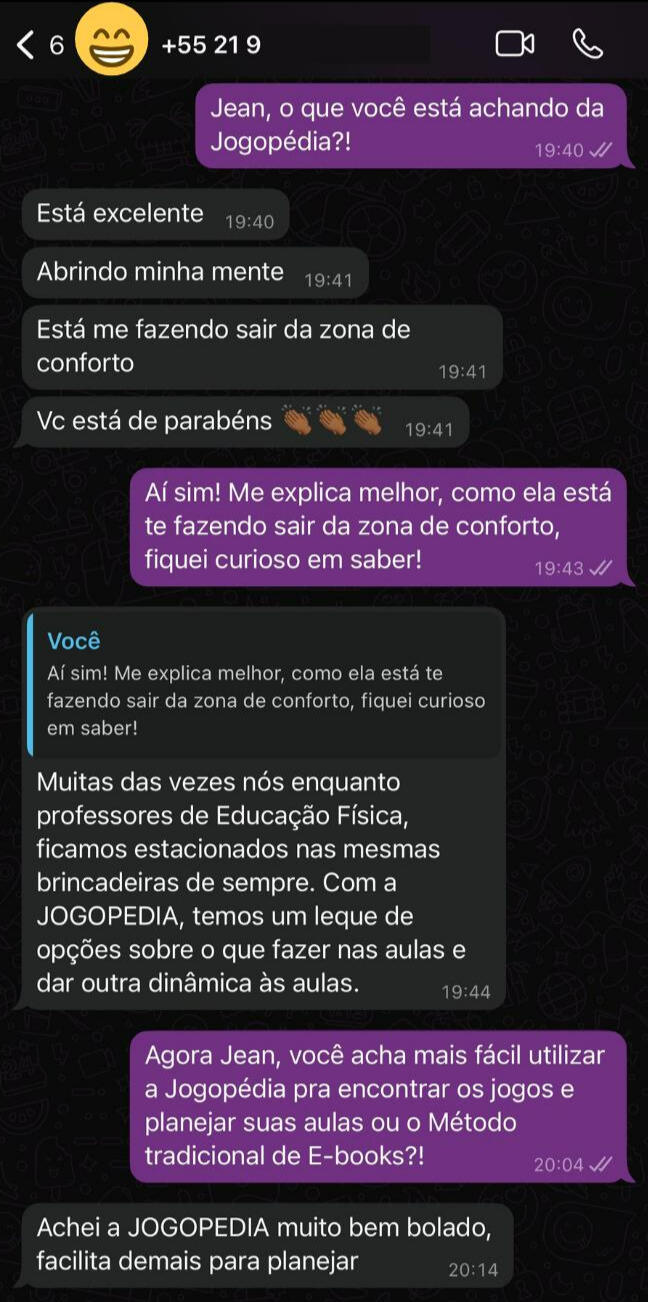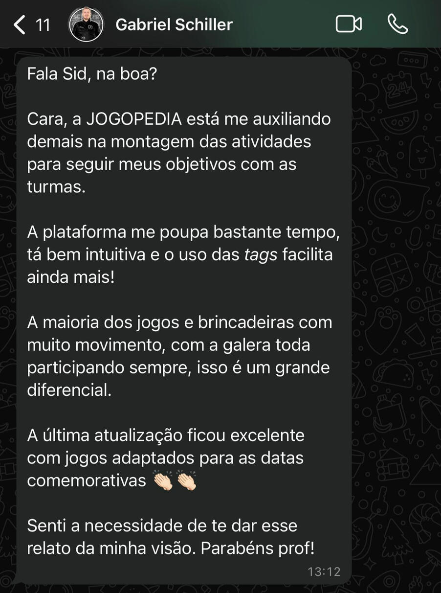 33 anos, Professor de Educação Física Escolar e Pós-graduado em Educação Inclusiva.Mais de 13 anos de experiência, impactando diretamente mais de 4.000 alunos. Sempre acreditando que a diversão é uma aliada poderosa no aprendizado.Idealizador da página @guiadobomjogo no Instagram, autor de 6 E-books, criador de 2 cursos online e formador de professores em cursos presenciais focados em Jogos e Brincadeiras.Agora, meu objetivo é compartilhar meu conhecimento na Educação Física Escolar com o máximo de professores possíveis, para alcançar ainda mais crianças com o poder dos Jogos e Brincadeiras!